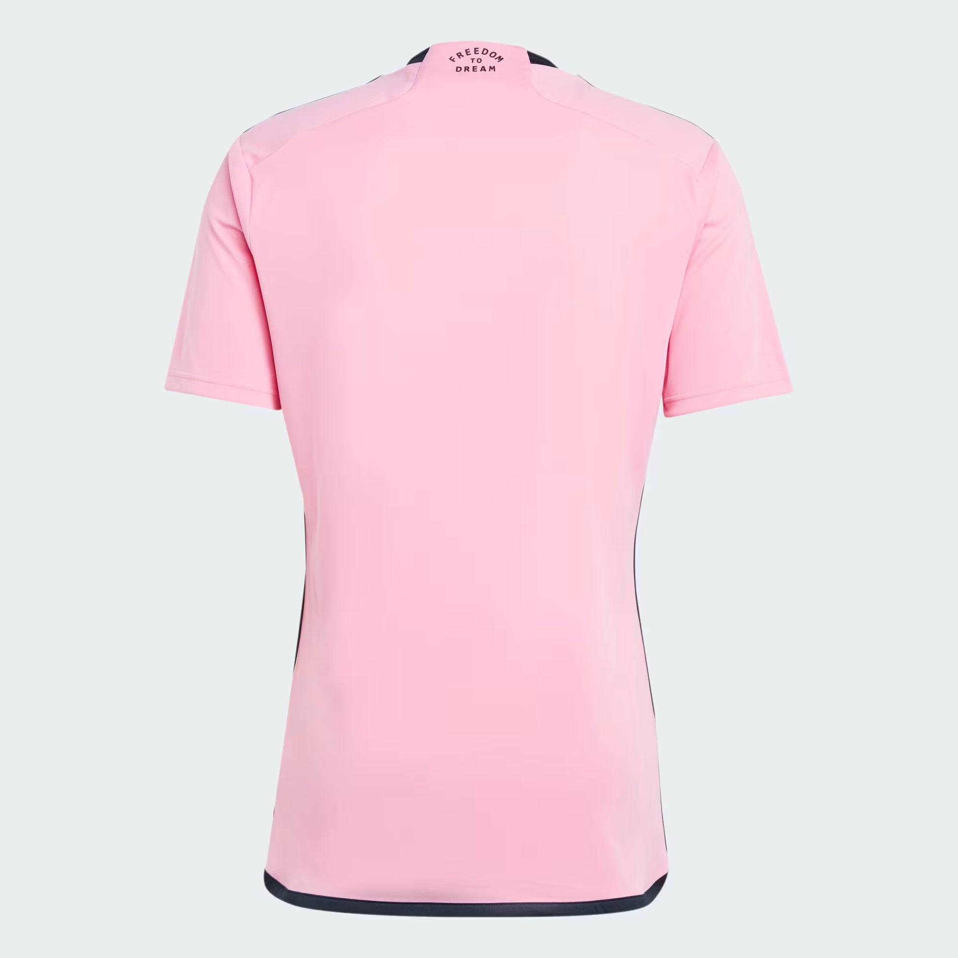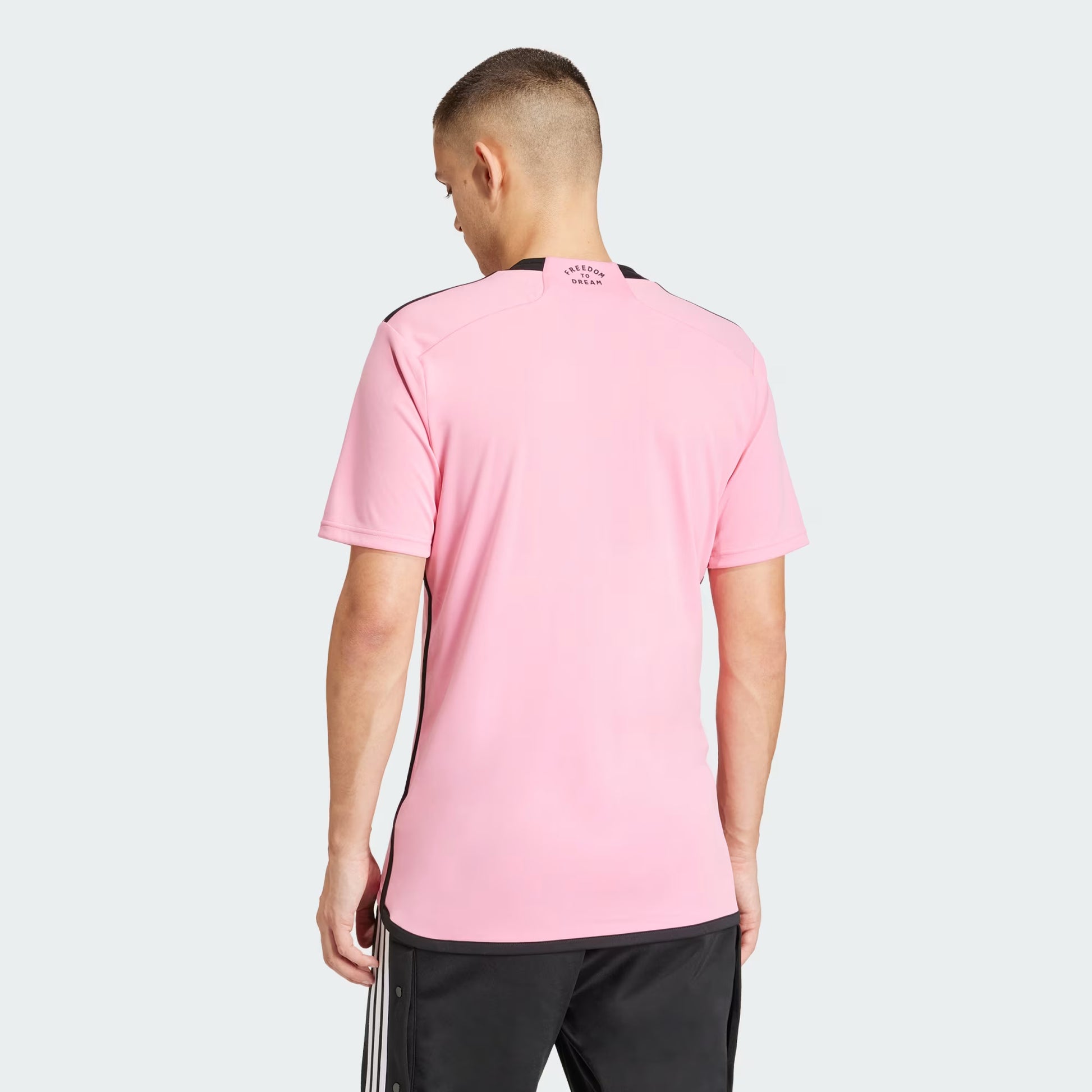 Proud. Passionate. Pink. This adidas Inter Miami CF jersey stands out in the club's signature home colours. Contributing to the clean, classy design, the team badge and 3 Bar Logo move to the centre. AEROREADY wicks moisture to keep football fans comfortable. The back neck signoff displays the team's aspirational motto, "Freedom to Dream."This product is made with 100% recycled materials. By reusing materials that have already been created, we help to reduce waste, reduce reliance on finite resources and reduce the footprint of the products we make.